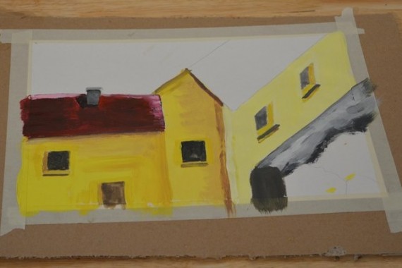 Nun malt ihr die Hauswände farbig an. Bei unserem Bild soll das Licht von rechts kommen, deswegen ist die schräge Wand rechts heller als die Wände, die nach vorne zeigen. Nehmt also unterschiedlich helle und dunkle Töne der gleichen Farbe. Mischt für hellere Farben ein bisschen Weiß mit hinein, für dunkleres Gelb mischt ihr es mit Rot, Braun oder Schwarz.